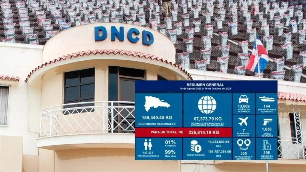 Santo Domingo.– La Dirección Nacional de Control de Drogas (DNCD) presentó este martes un balance general de los resultados obtenidos en la lucha contra el narcotráfico y el crimen organizado desde el 19 de agosto de 2020 hasta el 16 de octubre de 2025, período durante el cual informó se han ejecutado múltiples operativos con resultados contundentes.