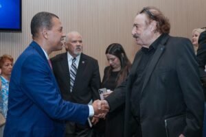 Guido Gómez Mazara saludando a Ignacio Ramonet.