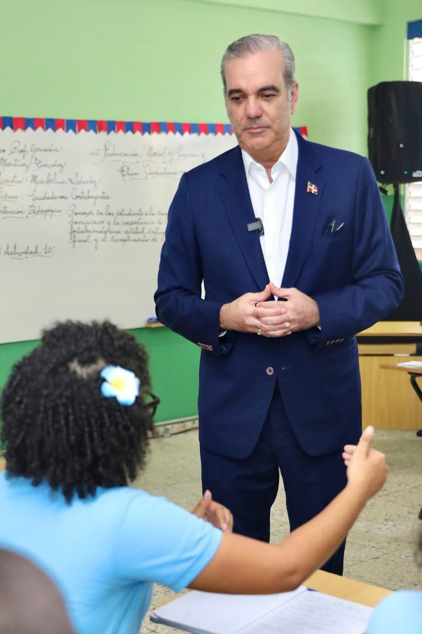Santo Domingo.– El presidente de la República, Luis Abinader, fungió este martes como docente al impartir una clase de Moral, Cívica y Ética Ciudadana a estudiantes de 5to grado del Liceo Germán Martínez, donde expresó que esta materia debe colocarse adelante en el sistema educativo porque permite formar mejores compañeros, mejores parejas, mejores ciudadanos y mejores dominicanos del mundo.