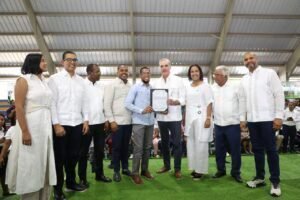 Neiba, Bahoruco.– El presidente Luis Abinader entregó este sábado 517 de un total de 792 certificados de títulos de propiedad del proyecto que se ejecuta en Neiba para garantizar el derecho de igual número de familias y con ello mejorar su calidad de vida.