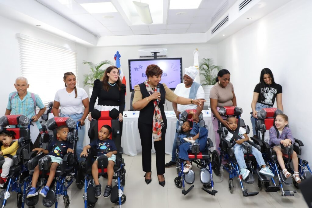 Santo Domingo.– El Instituto Nacional de Atención Integral a la Primera Infancia (INAIPI) entregó sillas de ruedas especiales y posturales a niños y niñas diagnosticados con parálisis cerebral, en un acto encabezado por su directora ejecutiva, Josefa Castillo Rodríguez.
